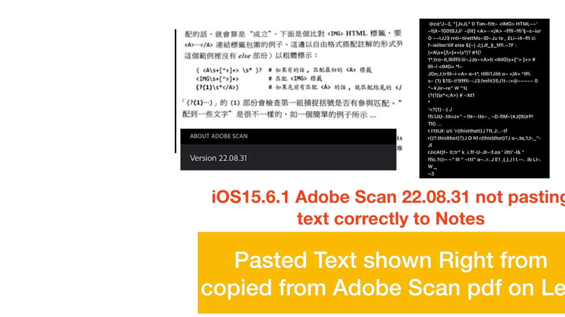 How to copy from Adobe Scan to iphone iOS15.6.1 Notes? screenshot below showing pasted text as gibberish