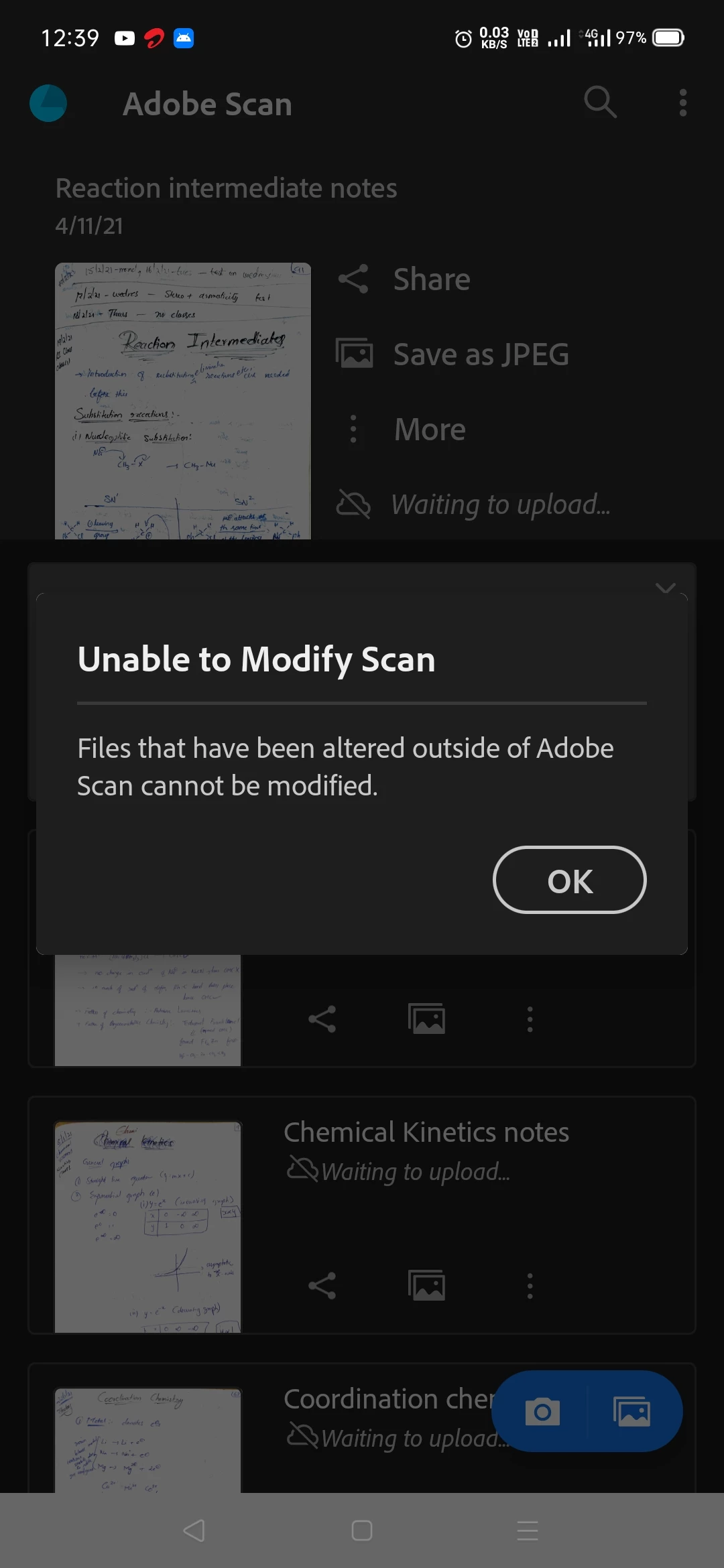 It always happens... I didn't even used it outside the app. Not even uploaded it to the cloud... By modification I wanted to add new pages... It worked fine for somedays... Not all the files happen to be the same. It's like more than 50 pages... I keep constantly add pages to the existing file. Does it have any maximum limit or what? This is the third time I'm facing this issue. Instead of just adding pages, I had to delete the entire file, and start scanning all the pages again for them to be in one file... Please help me with the issue...