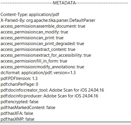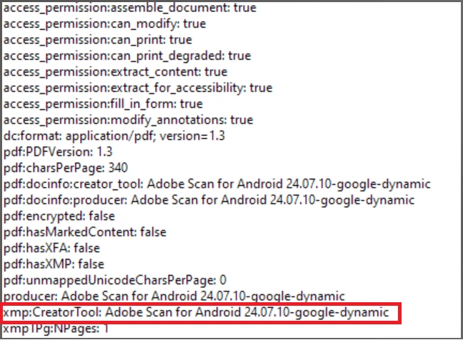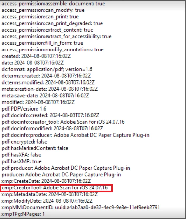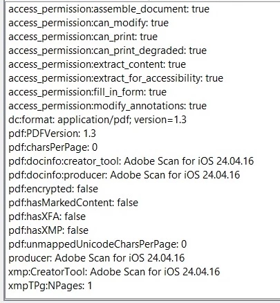I was able to find the following info below (first pic). HOW was this file created? Because when I do what I believe the user did - use Adobe Scan on an iOS phone I do not get this metadata at all. I get something else which I will attach below for comparison (2nd pic).