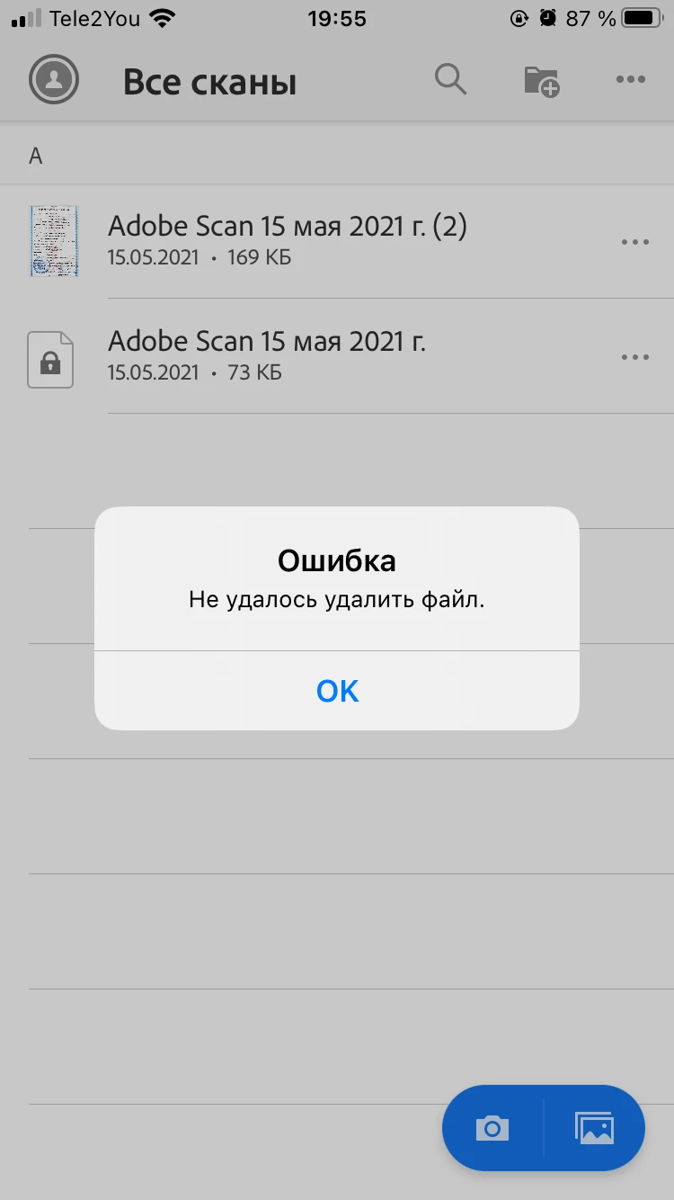 Не могу удалить 2 скана, которые я когда-то делал. Жму удалить - выдаёт "произошла ошибка". На них ещё и замок стоит по какой-то причине, однако открывать и просматривать я их могу. Как их удалить?