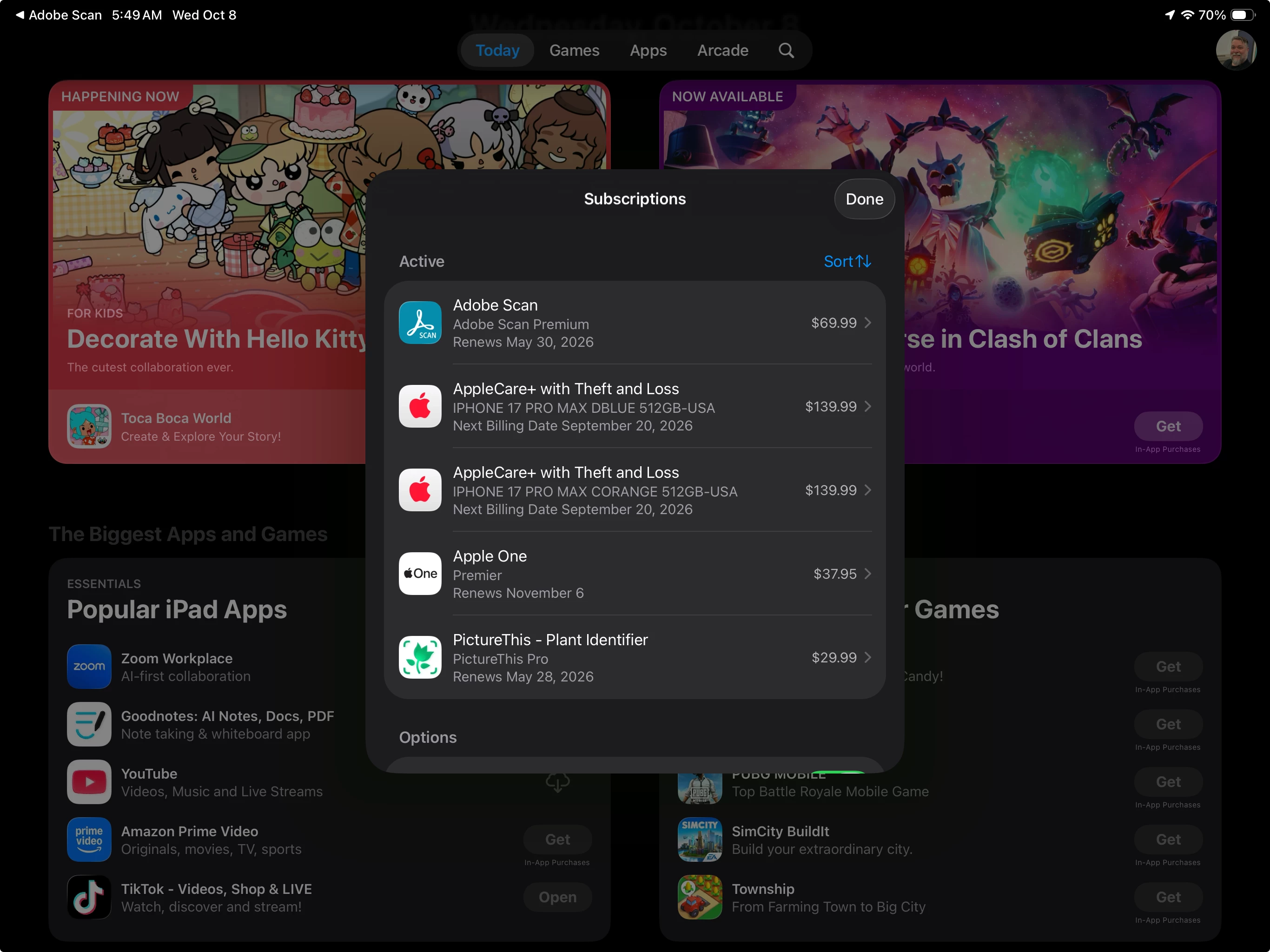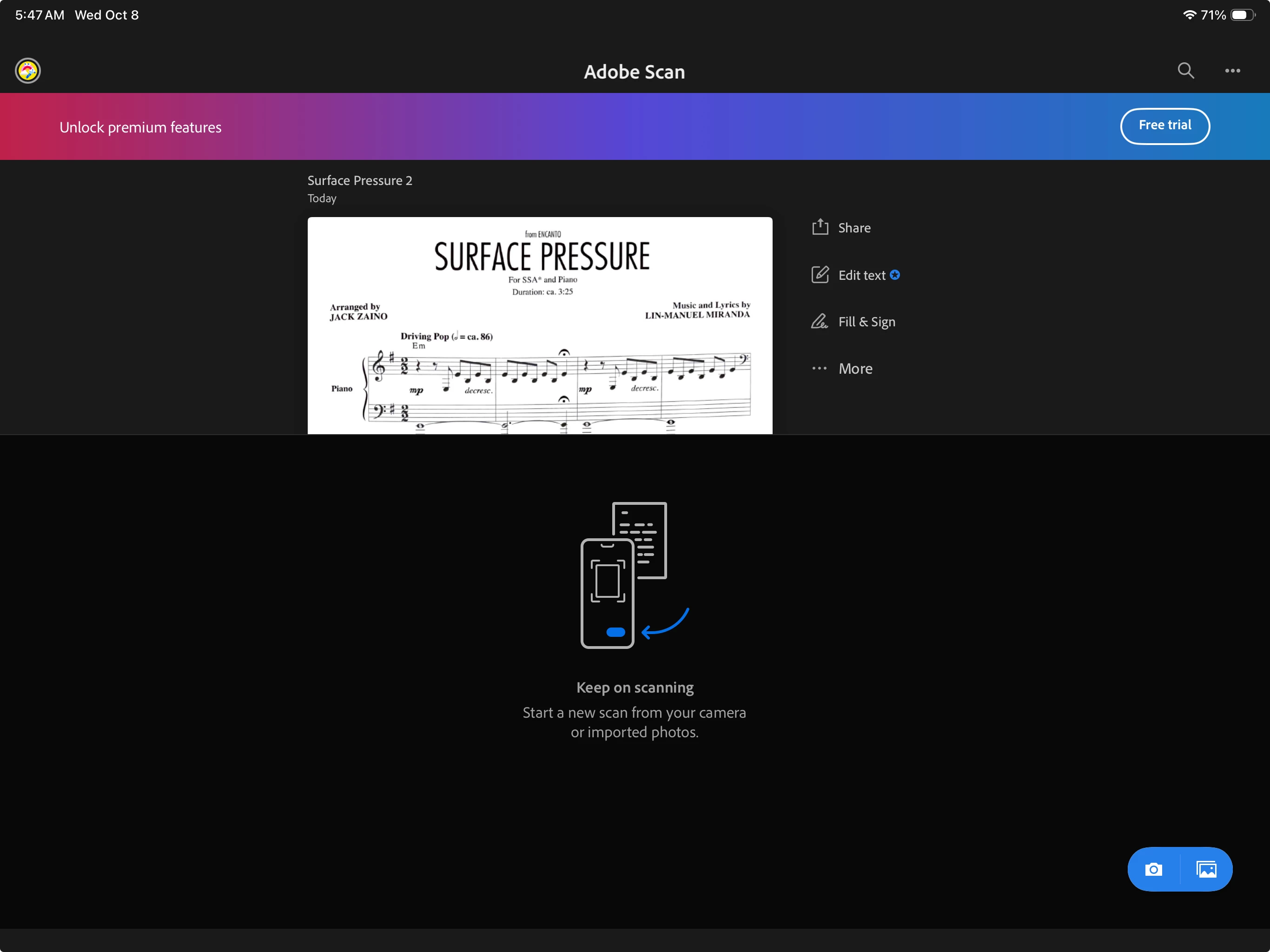 I am experiencing this same problem. Adobe LOST my subscription. Same email... same login. Using APPLE to sign in.. I just logged in on another device and ONE of my scans was there and had a scan date of TODAY, as you can see by the attached photo.. the screenshot with the music in it was from several years ago. NOT today.. so there is some mismatch on Adobe's end that is causing this.