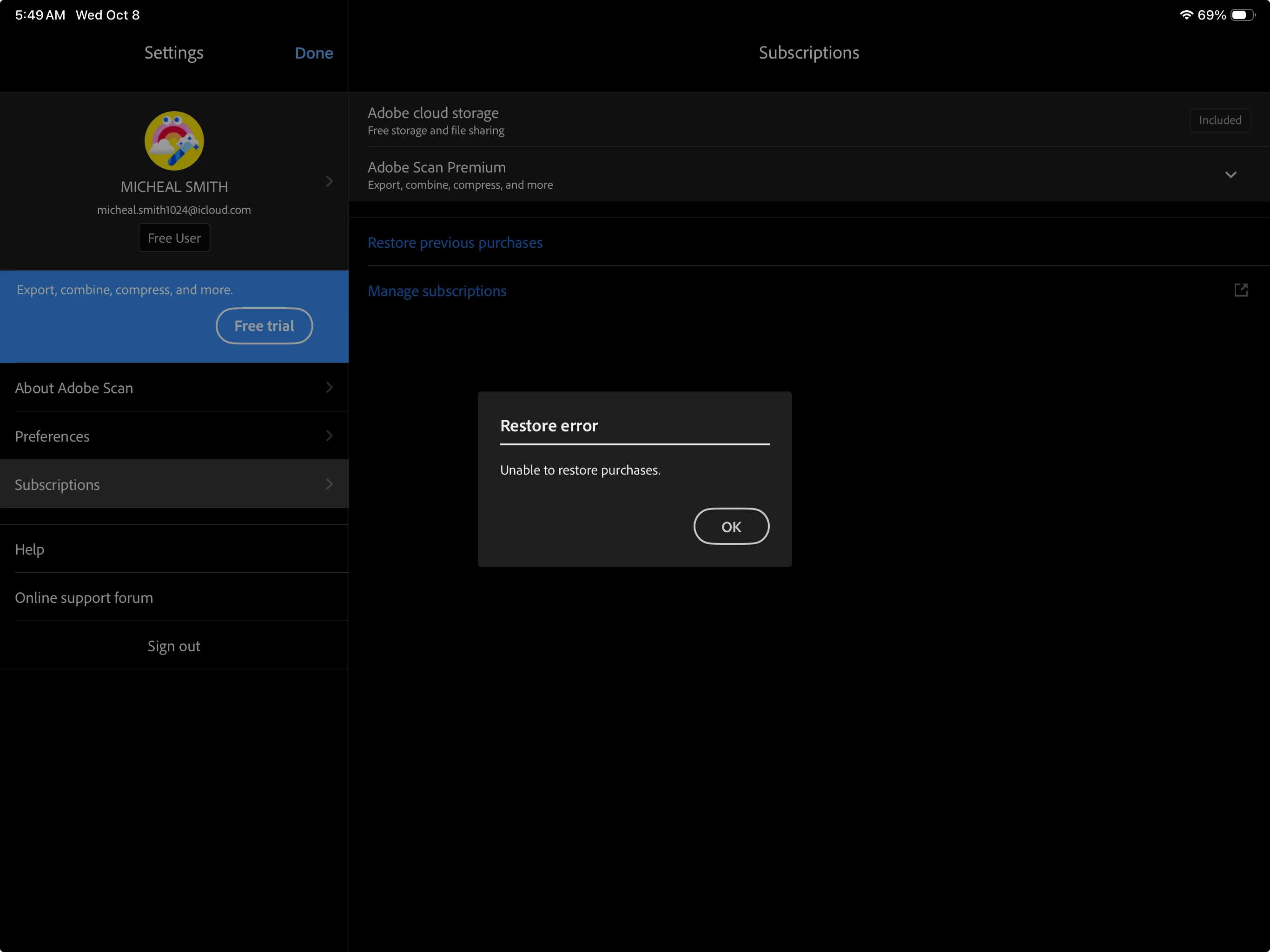 • Once the device has restarted, log back into the app using the correct Adobe ID/email address associated with your premium subscription.