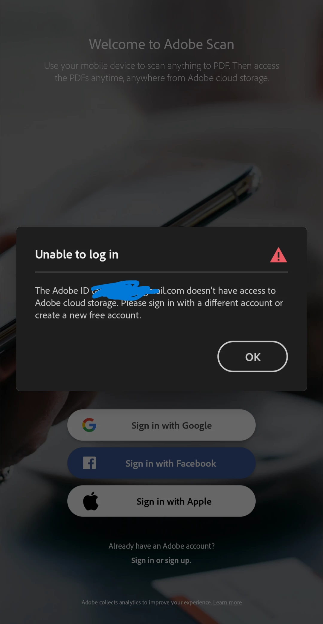 When I try to log in to Adobe Scan with my account, it says "doesn't have access to Adobe Cloud storage"?