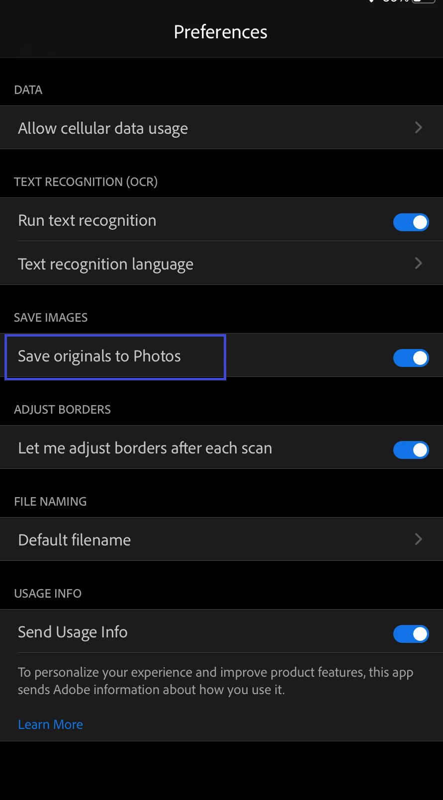 If you wish that when you scan the document, it also get saved as an image on the device, you may enable the option "Save original images to Gallery" (Android) or "Save originals to Photos" (iOS) under Adobe Scan preferences. It will save an image of the document automatically on the device gallery or photos folder. Use the steps as mentioned below to enable the option.