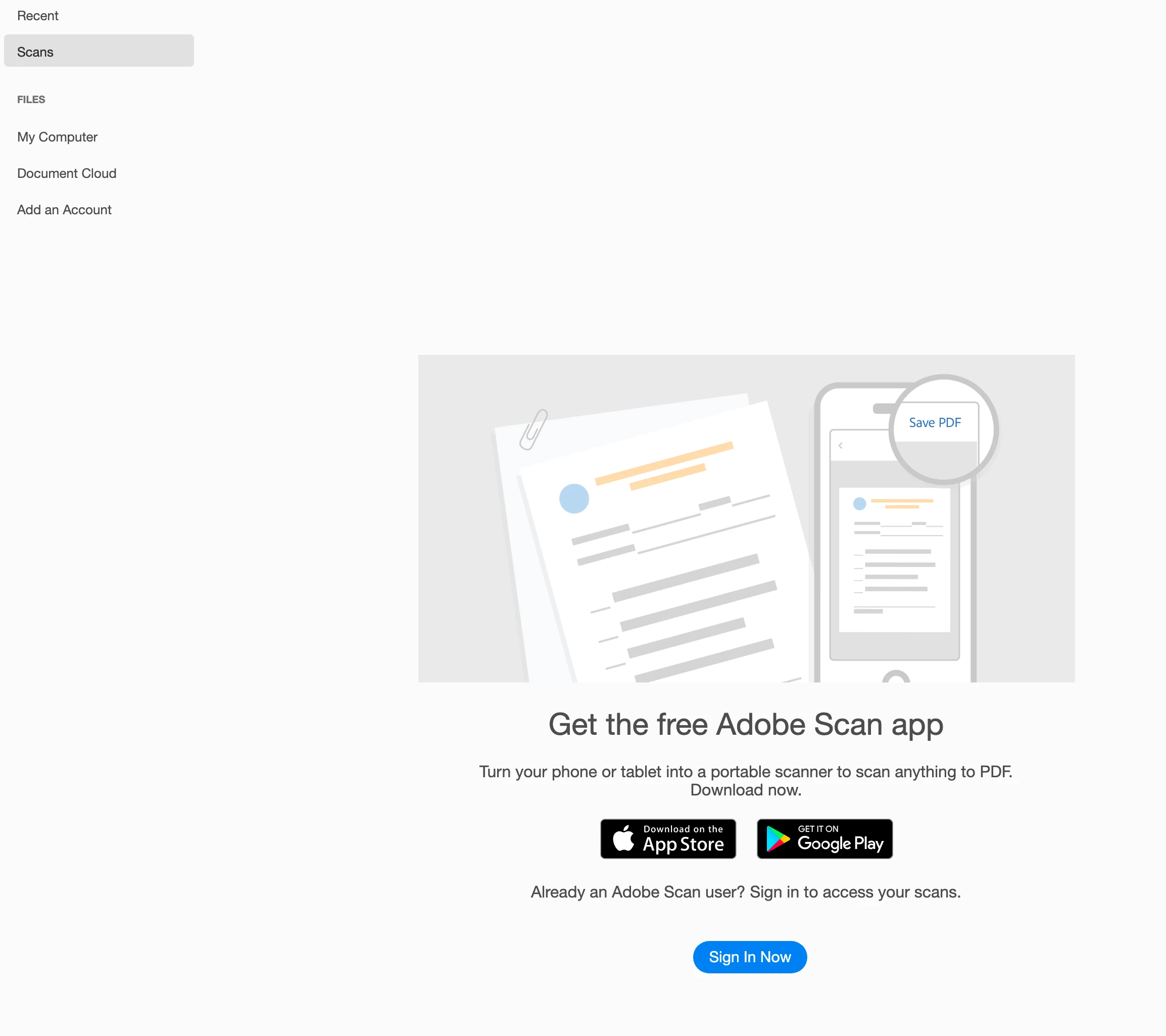 "Scans" in Acrobat no longer shows all the Scans I've saved. I get a page which says I need to Sign In, but I am Signed In. Clicking the Sign In button does nothing. All my scans are inaccessible.