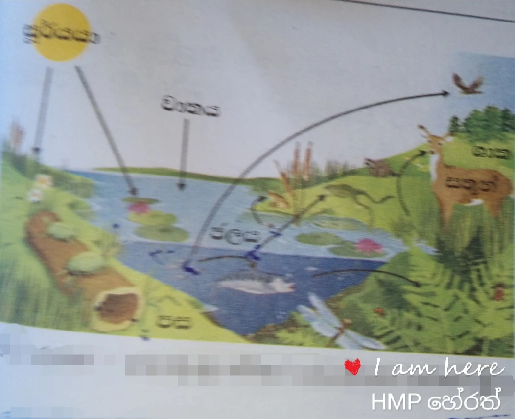 - පහත රූපයේ දක්වා ඇති පොකුණු පරිසර පද්ධතියේ ජීවි ජීවි හා ජීවි අජීවි සමක දක්වන අන්තර් ක්රියා ලියන්න?
