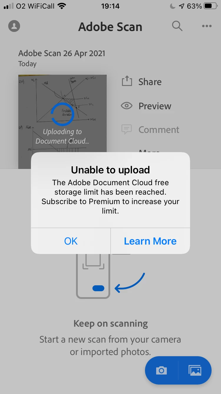 I have recently subscribed to Adobe premium on the Adobe Scan app on my iPhone. However, none of my scans are being saved to the Adobe cloud and when I try to scan I just get the following error message: