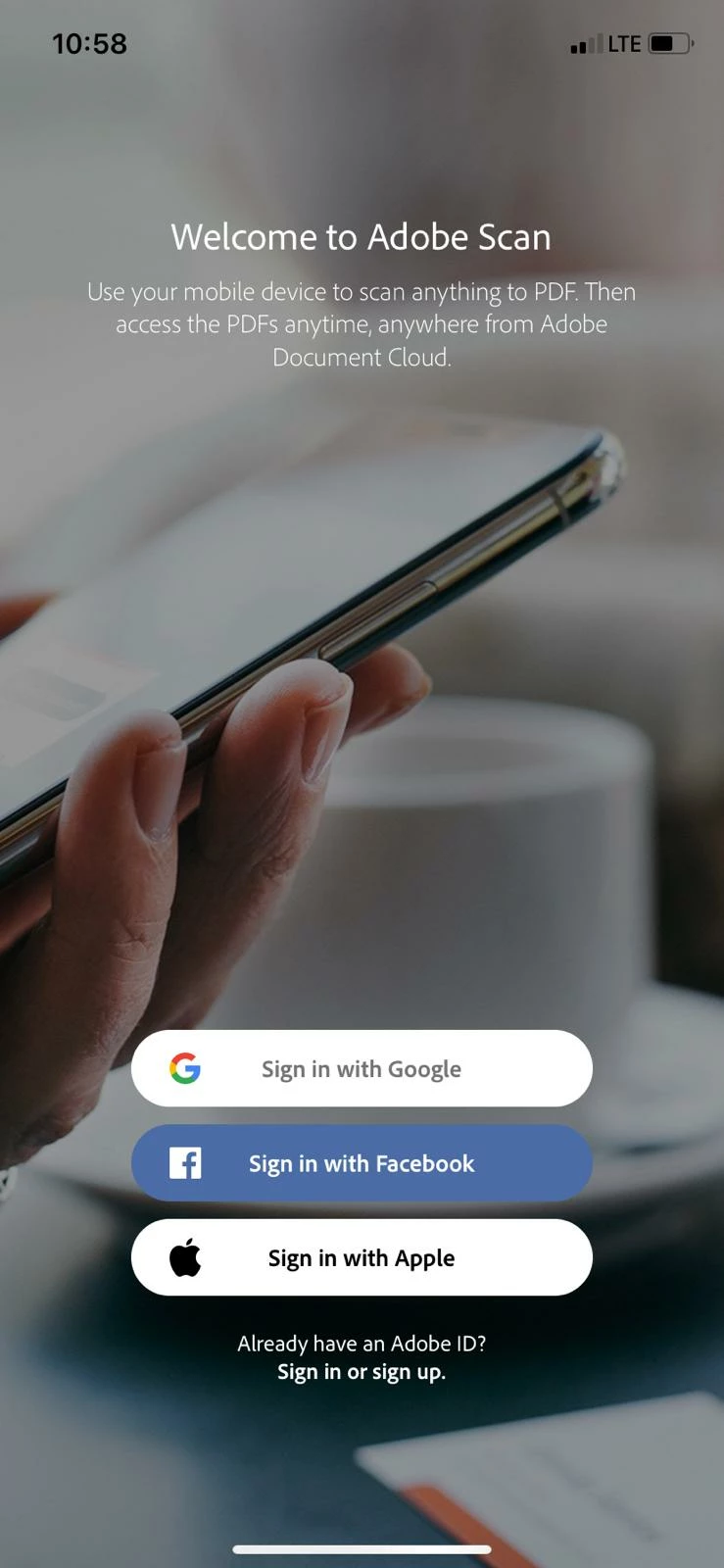 Whenever I try to use Adobe Scan on my phone (ios 13.6.1), I am sent to the "Welcome to Adobe Scan" login page (attached).