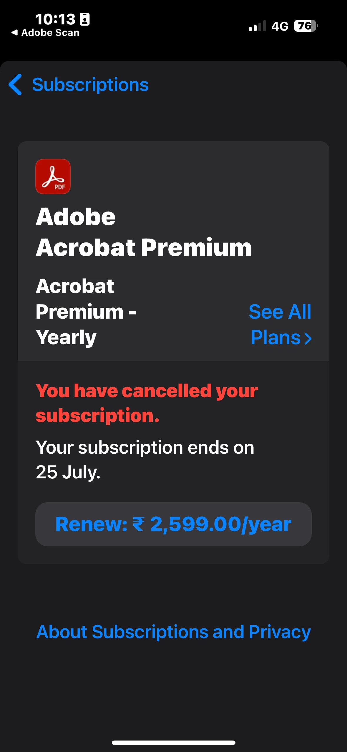 I had taken a free trial subscription of the Adobe Scan app. I subscribed to the 7-day free trial on the 19th, and I canceled the subscription on the 24th, well before the trial period ended. However, today an amount of ₹2,599 has been charged from my account via auto-pay.