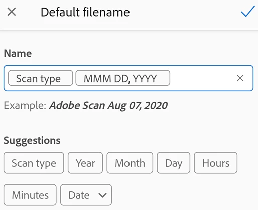 The scan app names all files “Adobe Scan (current date)” by default. However, you can change the title, date format, and add any string as needed. Custom names can help you organize and find files.