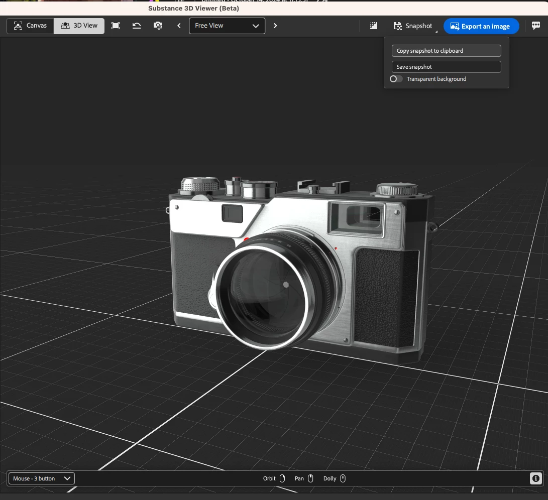 Here you can see a screenshot of Substance 3D viewer with a 3d model of a camera opened. At the top of the interface we click on the "Snapshot" action and choose to copy the snapshot to clipboard with transparent background.