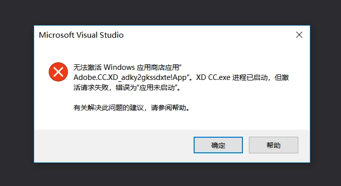 在最近的一次更新中,微软似乎解决了应用商店的一些BUG,我的应用商店以前是打不开的,更新后恢复了正常。但是意外的是,XD竟然无法打开了。我尝试用visual Studio调试XD,它提示如图,可能真的和应用商店有关系。