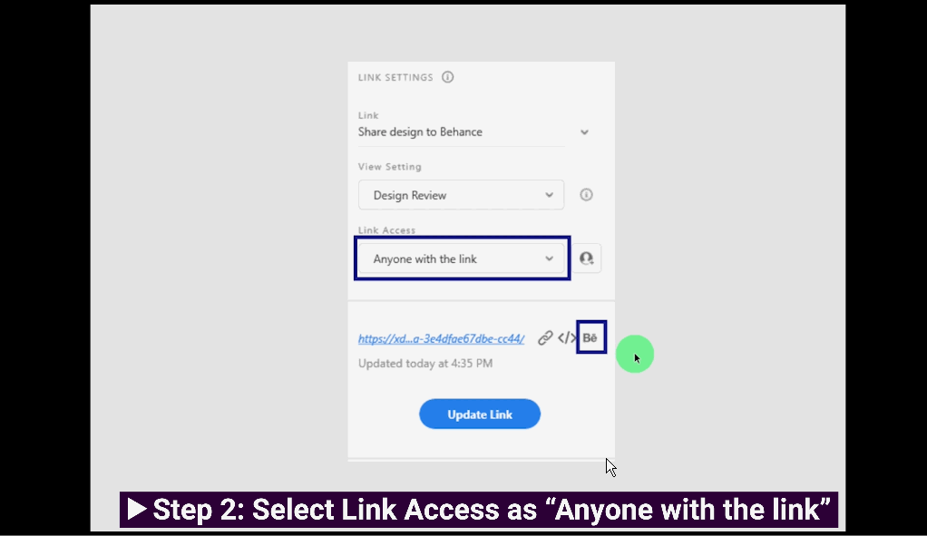 2. In the Link Settings section of the Property Inspector, choose Design Review. Then, in the Link Access drop-down, select Anyone with the link to generate a public link. If you publish a private or password-protected link, you can't share that link with Behance.