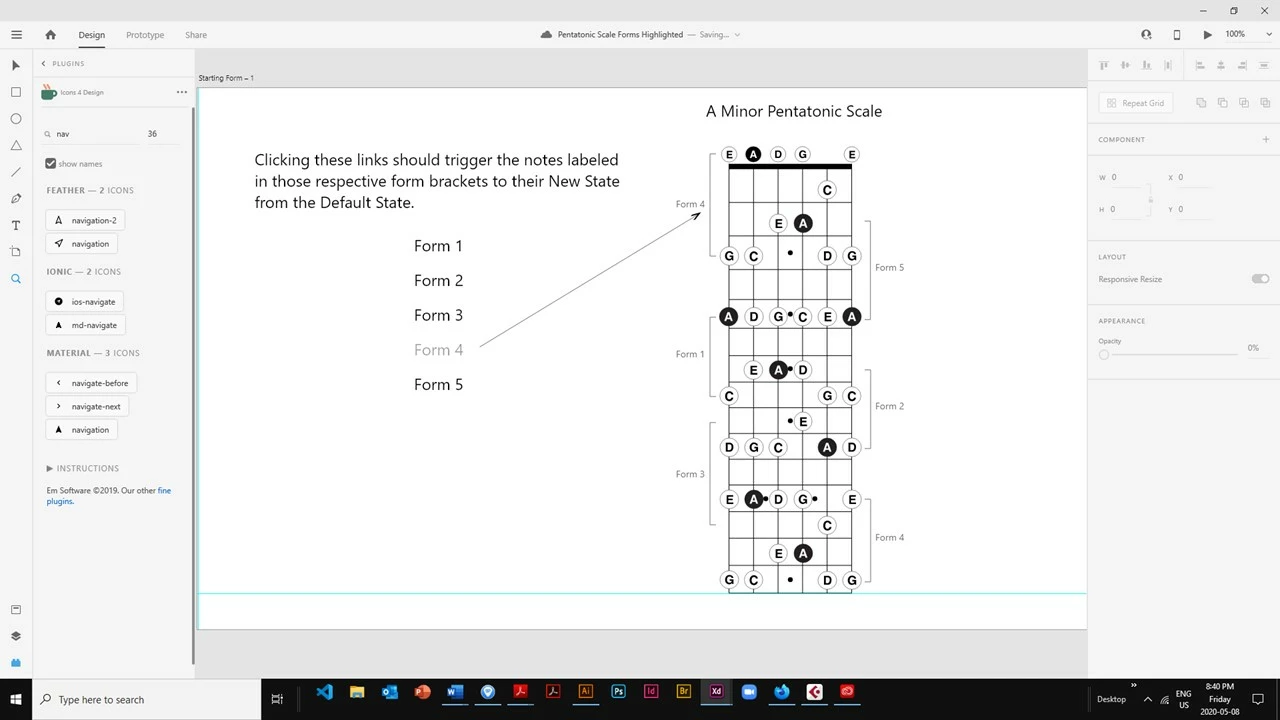 Basically I want to click on some text (or a button) and that action transitions other objects on the SAME artboard to their New State. The new state is a colour change for the objects that are grouped together (and were made a component of course to add the new state). In prototype mode ive added a hover state and then another interaction for the text to try to go to the new state destintation of the other group but their new state is not available in the drop down menu as a destination! Why? The task is a guitar fingerboard with notes labelled on top of it. I want to highlight some of those notes depending on the trigger destination. FOr instance to see certain notes change colour (new state) to highlight them such as A minor notes light up when you click on the text A minor etc. Right now i have to have multiple artboards each with a drawing of particular notes coloured in on the fingerboard then link to each illustration from the text or button trigger. I'd really apppreciate some help with this. It should be possible to accomplish this but apparently I lack the skill to figure it out!