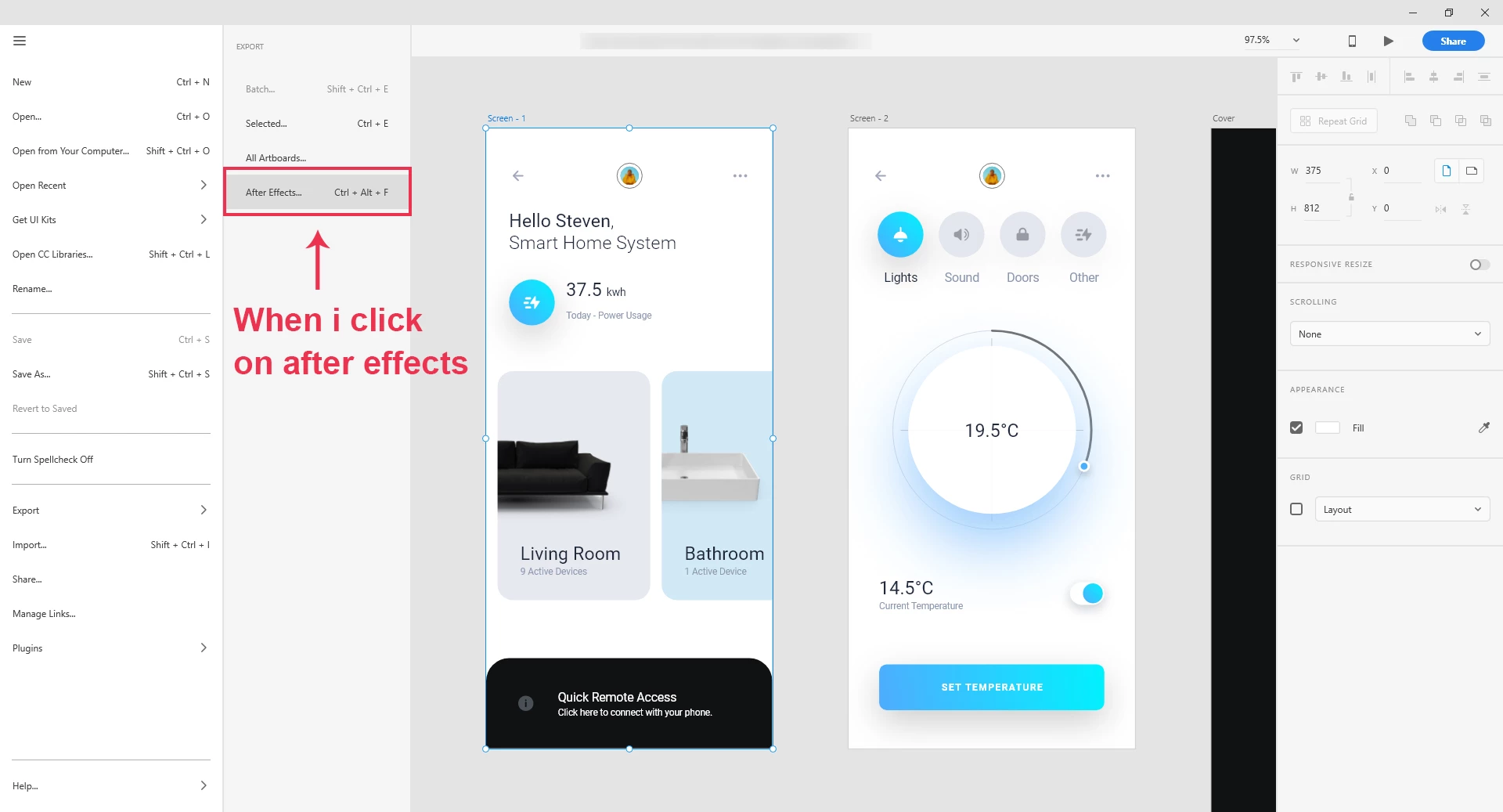 When i click on export to after effects, it only opens a new document in after effects. I have also attached some images below.