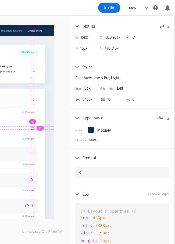 When sharing a UI prototype link which is set for development view so the developers can go in and get the CSS styling and source the exact icons used from the Font awesome library, it should tell the name of the icon within the content tab.