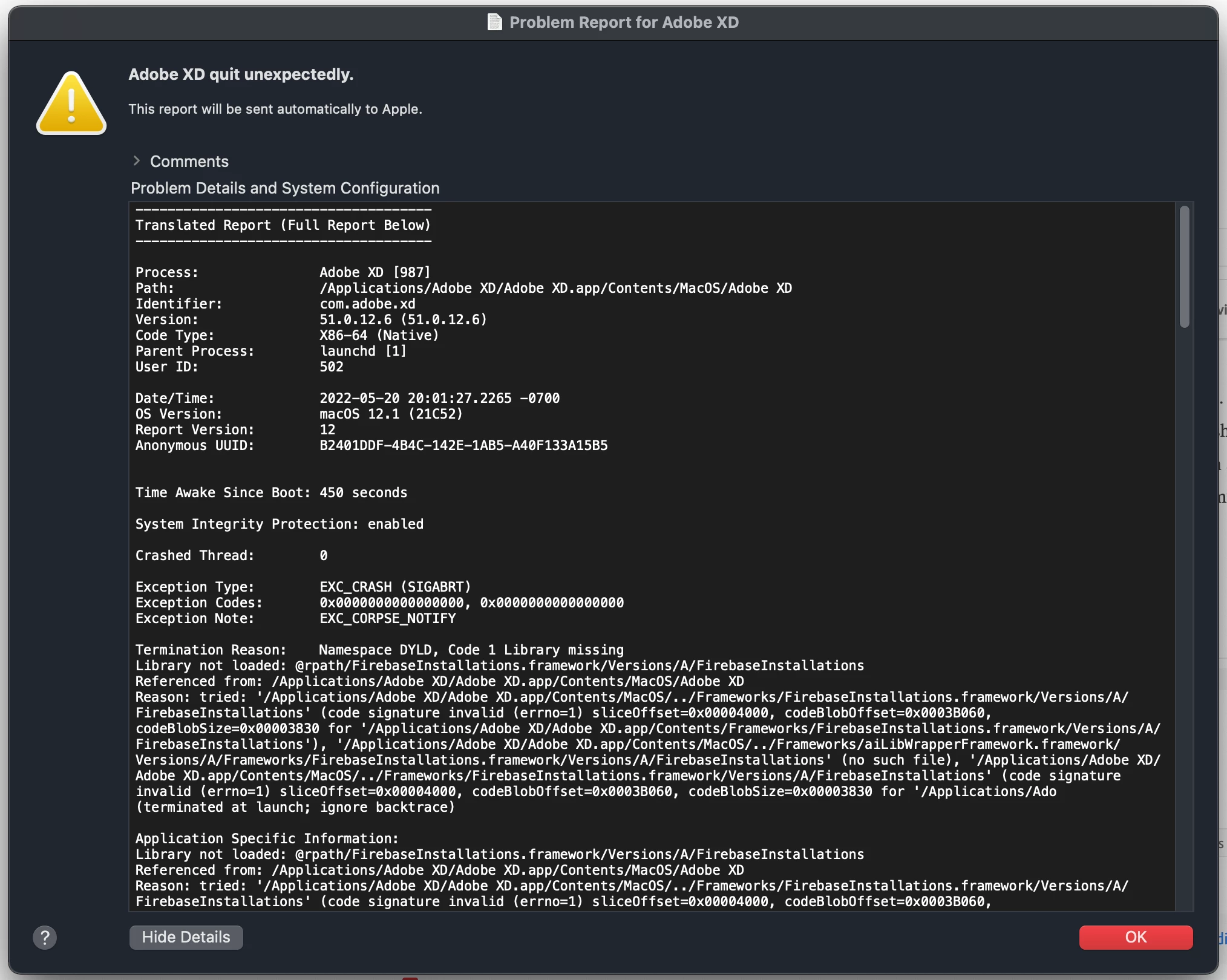 I have been trying to install Adobe XD 51.01.12.6 on my macOS Monterey 12.1 the last couple of days.  XD will install, but when I try to open I get an error that says "Adobe XD quit unexpectedly" and sends a crash report to Apple.  I have uninstalled/reinstalled, shut down/restarted my computer and also logged in and out of the creative cloud...repeatedly.  I have not found anyone else with this exact problem in the community or with a Google search.  Any ideas out there?