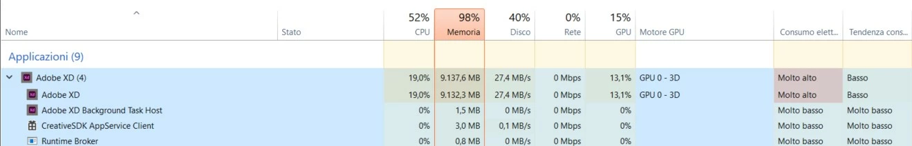 Hi, i'm having this issue from a long time and several versions of XD. Sometimes when i rapidly click for zooming in the view zoom straight forward to the maximum zoom and the program freeze completely. I can't move, close the window or do anything. Also on Windows' task manager i can see the Adobe XD process using an unusually high amount of RAM (as in the picture).