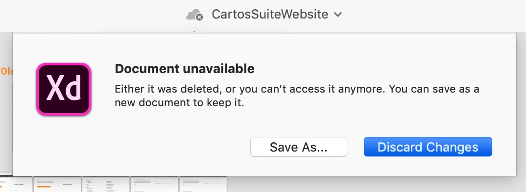 I have been working on a project for a client. I've been co-editing with 3 other coworkers, and loving our experience so far. However, last night one of my co-editers recieved the message below. This morning after the rest of us updated our XD, we all started receiving the same message. None of us deleted the project. However, to add to the confusion, I double checked the trash in our create cloud account, and there was nothing there. I'm also unable to load the screen to see what cloud documents are still available. I also tried clicking the "save as" button in the below image, but instead of letting me save a copy of this project it gave me a quick error message then closed all of my XD windows. I'm not sure what else I can try besides clicking the "discard changes" button. I'm not sure how much work we'll loose if I do that. I would rather find where my file disappeared to. Is there something else I can do? Help!