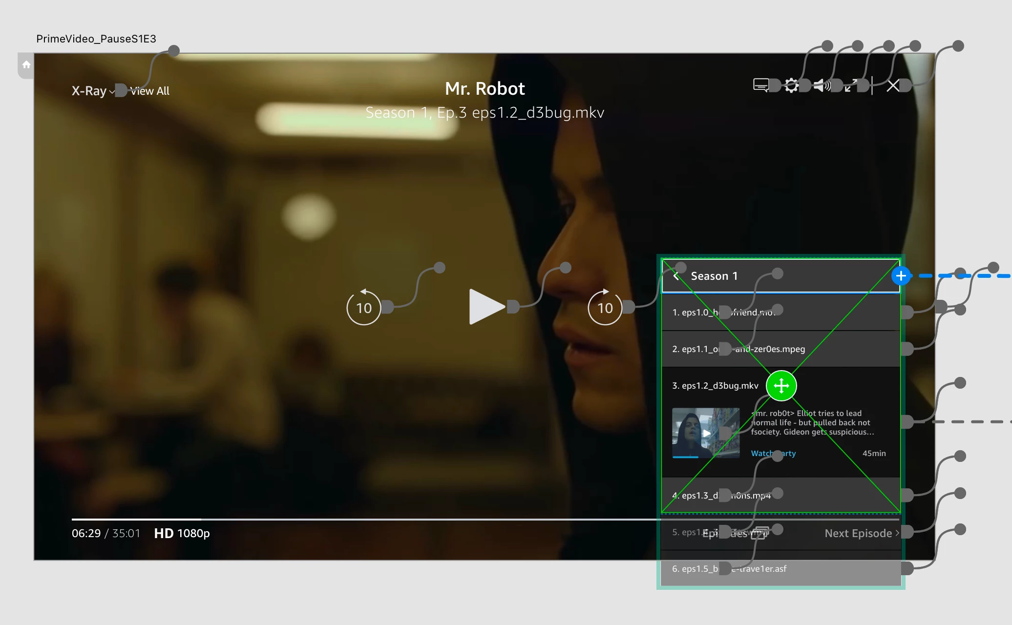 As part of a project I'm working on, I was creating an icon on a video player which when clicked should open the 'Season 1 menu' with a particular (current) episode selected (Let's say 'S1 E1'). Upon clicking on its Title 'Season 1', one would be brought back to the main 'Seasons menu'. Such menu would display hover interactions for the '4 Seasons' available, with only 2 of which clickable (Season 1 and Season 2).