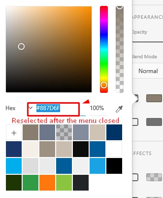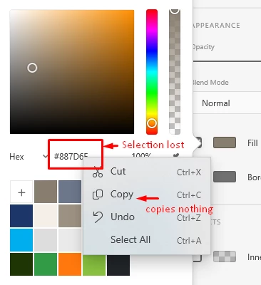 In the color picker, in the hex color code box, you cannot right click the highlighed color code and choose copy from the context menu as it does not acutally do the copy. This is 100% repeatble.