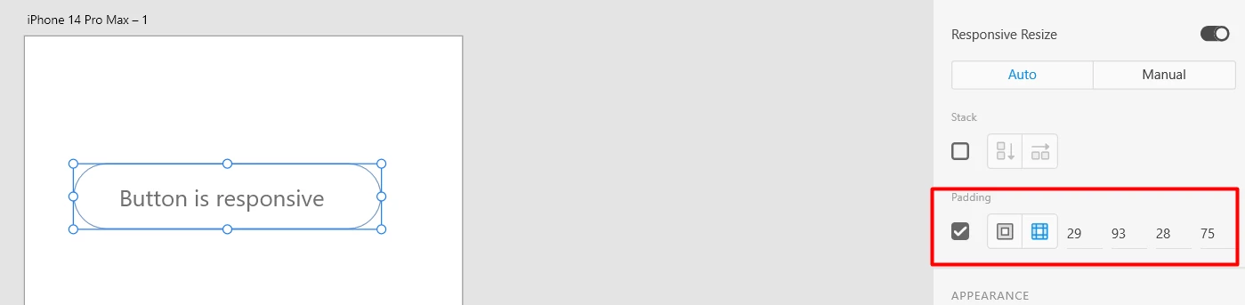 Now, when I do the same steps, it shows the number of pixels of the padding as "0 0 0 0", and if I write a different text, it does not scale the rectangle in the button group correspondingly.