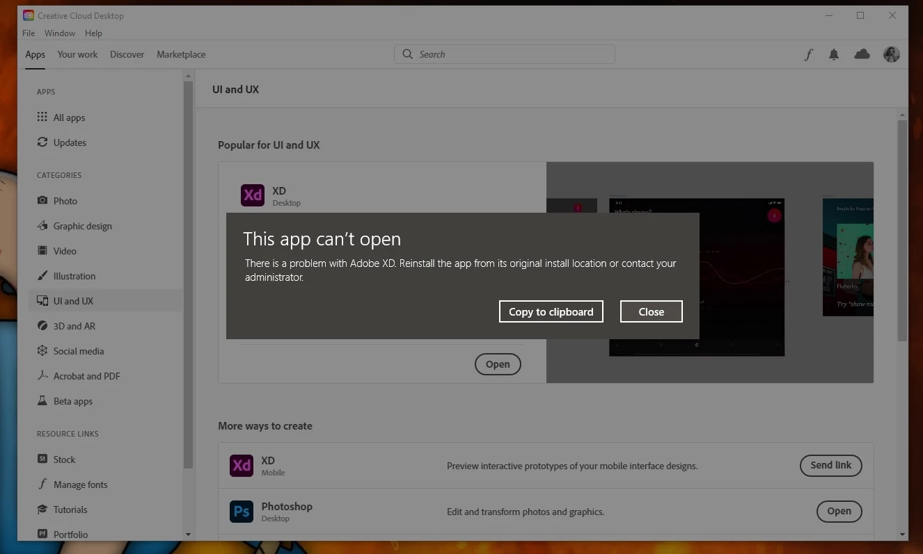 Can't run Adobe XD on Windows