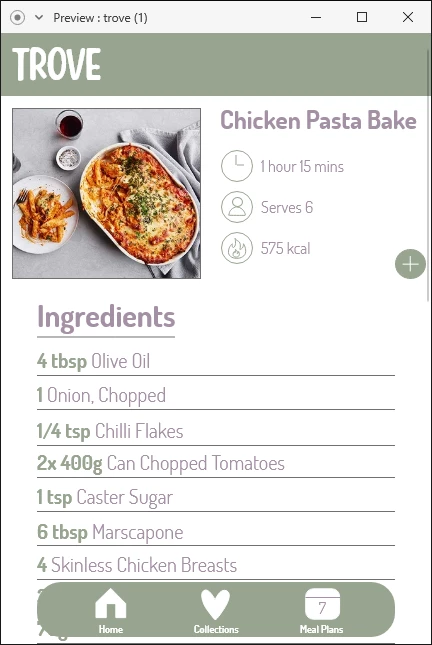 As you can see the + icon would act as a way to save recipes, would be pressed, and then saved into the 'Collections' artboard and featured there as an icon (similarly to the Icons displaying each recipe on the welcome page).
