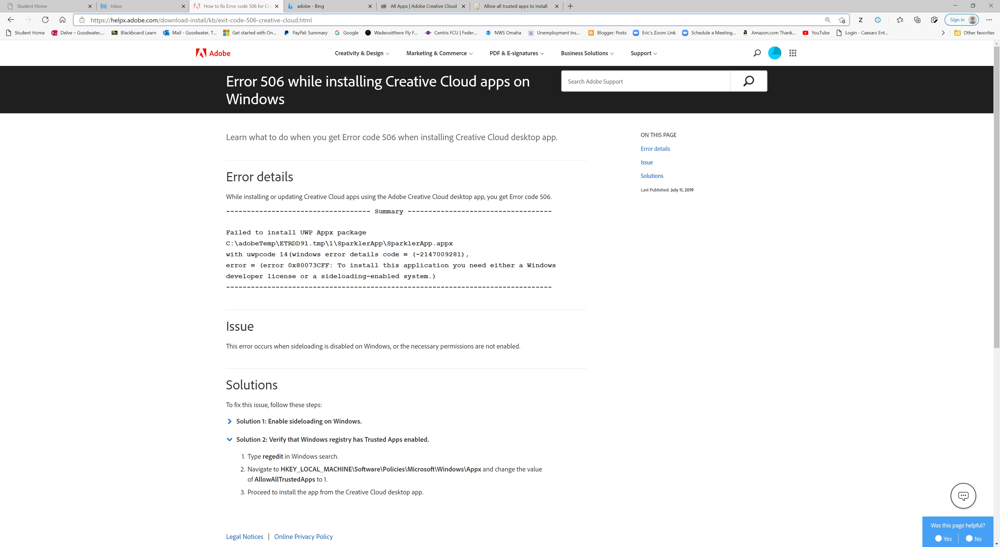 I am taking a college class and it requires me to download Adobe XD. My computer will not let me and I have tried solution 1 and I am not able to change any settings within that page.