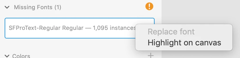 The MacOS font suite, San Fransisco, is buggy in Xd. It will frequently replace itself with a placeholder font, even when its enabled in Fontbook. The "Replace font" will sometimes be disabled here. I don't know why. so I get stuck with these messed up fonts and my file is pretty much destroyed. I'd like to be able to remove SF from my files entirely but I can't do that either for the same reason.