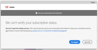 We can’t reach the Adobe servers. This may be because you’re not connected to the internet. Check your connection and try again below. If you’re still having issues, please see our connectivity troubleshooting guide."