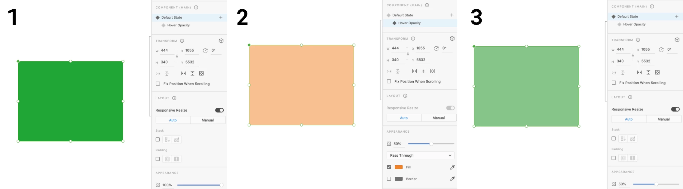 I'm trying to change the opacity of this rectangle when the object is hovered on. However, when I change the opacity in the Hover State, it also changes the opacity of the whole component. I've screenshot the three steps below to illustrate the issue
