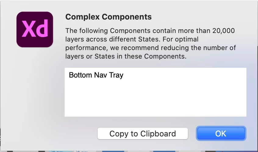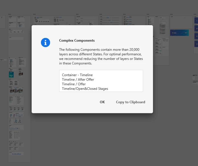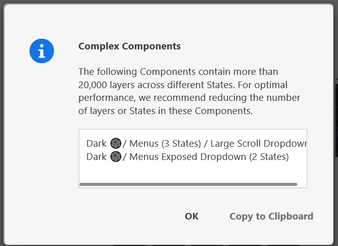 My team and I have been getting a message when we first open our files that we have a component in our shared library with more than 20,000 layers. This component that's called out has nowhere near that amount of layers, however. It has a little over 100 layers including all of the vector icons and masks.