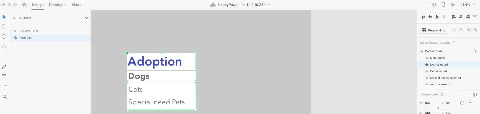 When prototyping I added the trigger "hover" on the entry "dog" with destination "state selected"
