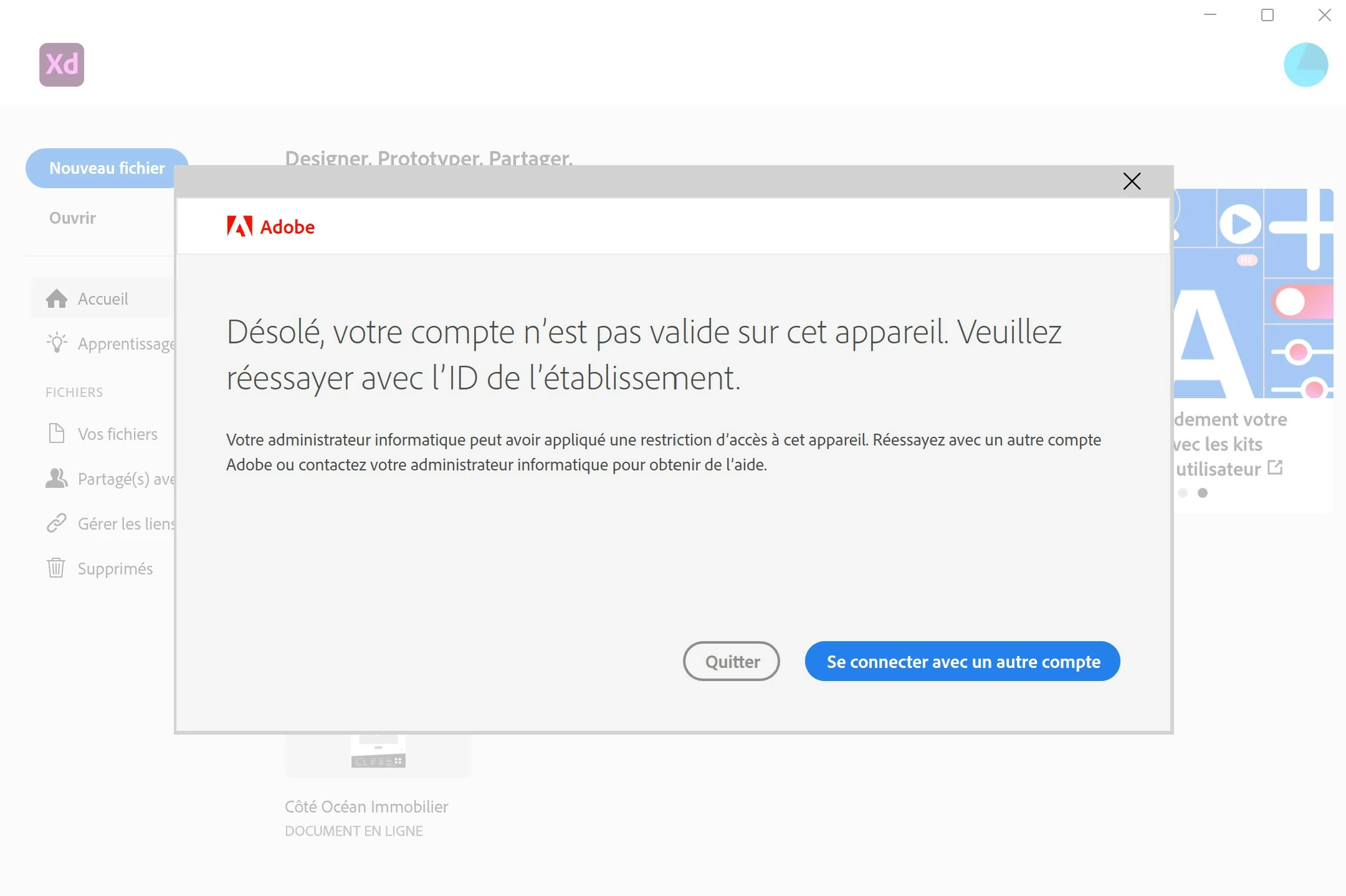 Bonjour !! Besoin de votre aide, j'ai un gros travail sur ma session Adobe !! J'ai reçu cette notification, je ne sais pas quoi faire, je ne peux plus ouvrir Addobe XD, il se referme de suite après fermeture de cette notification ! Comment récupérer mon travail ?