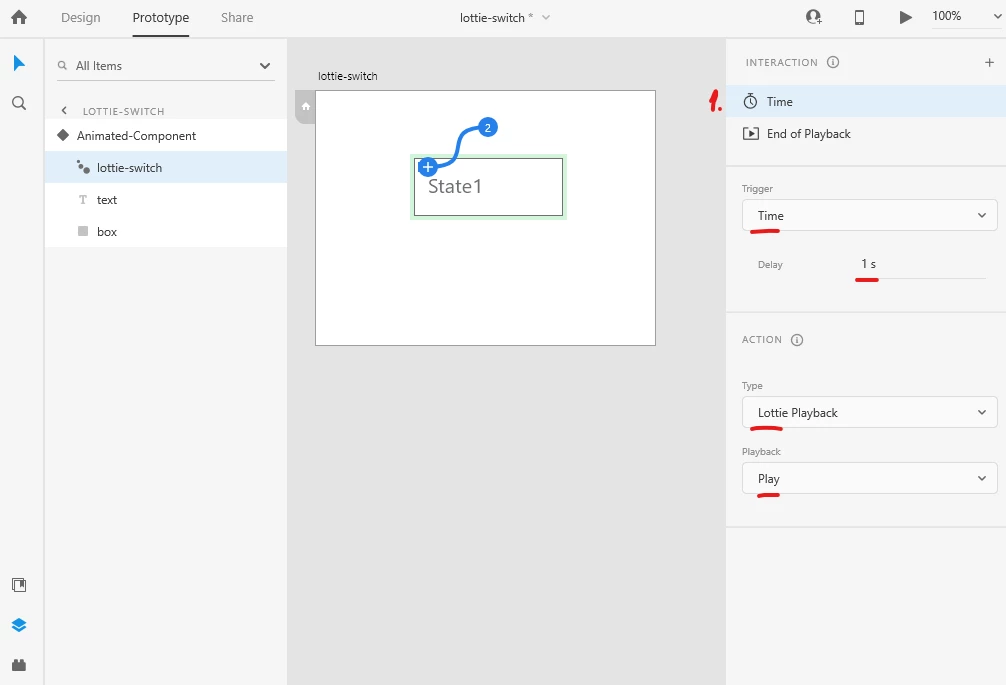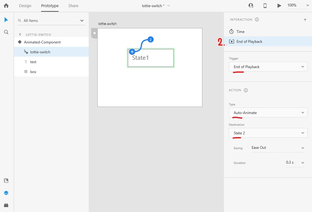 Now in State 2 of the component, we have the same lottie-switch, but at its "End of Playback", it switches to State 3. And in State 3, we have the same switch which points back to Default State. And the whole thing loops every second, because that's what we pointed as our Delay in the Time interaction.