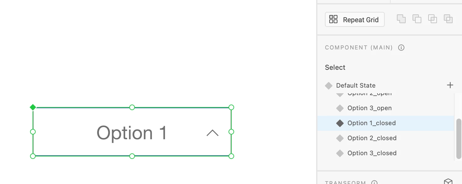 I then duplicated instances of option 1, 2 and 3 and put them in the Select component in a new state named 'Default State_open'