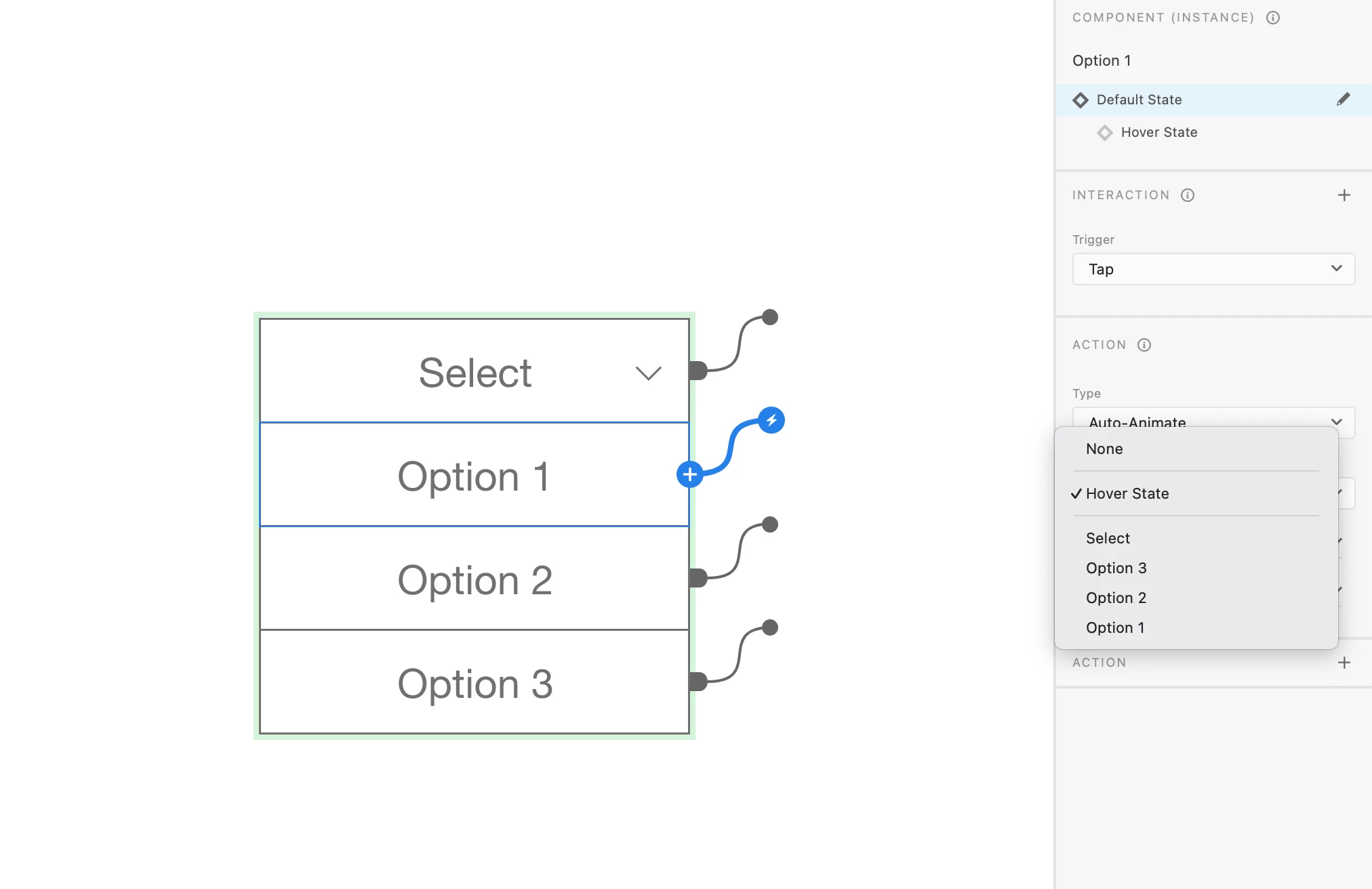 I moved to prototyping mode to connect the nodes but I noticed it won't let me connect option 1 to the closed option state I had created. It doesn't appear in the dropdown options. I know its because its an instance of a component, but it there any better way to go about this? I would like to maintain the hover effect on each option while also being about to select them