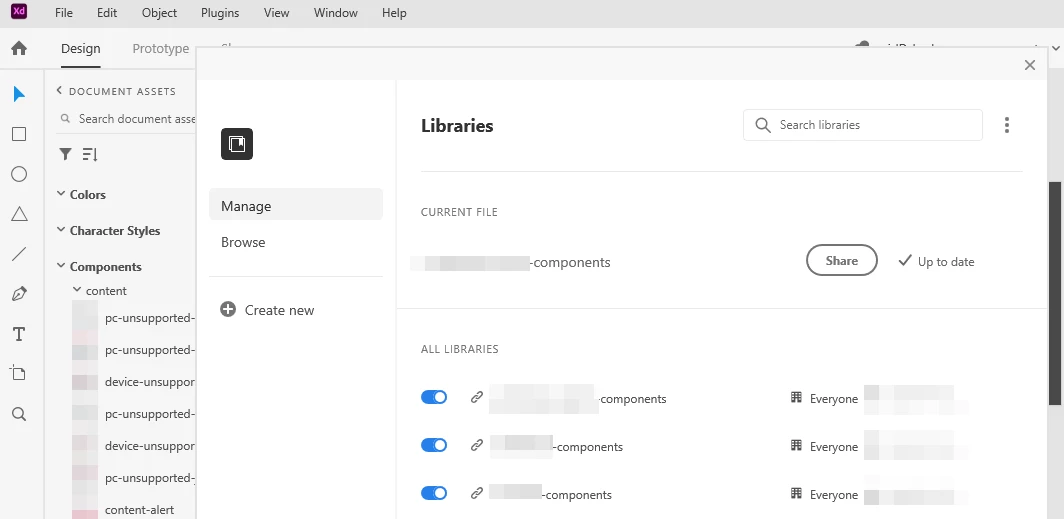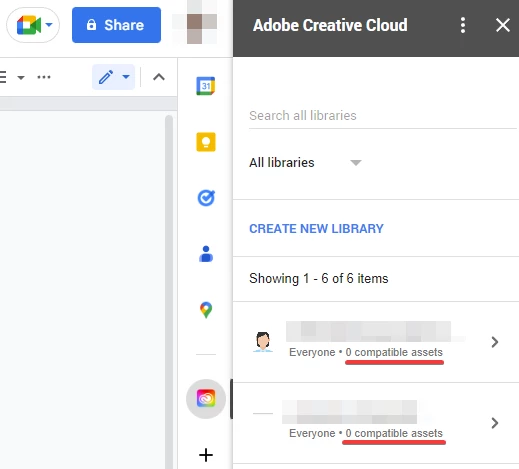 I do get the Adobe Creative Cloud sidebar showing with the libraries shown inside but the only compatible asssets seem to be colors. No trace whatsover of components such as UI elements, icons, etc.