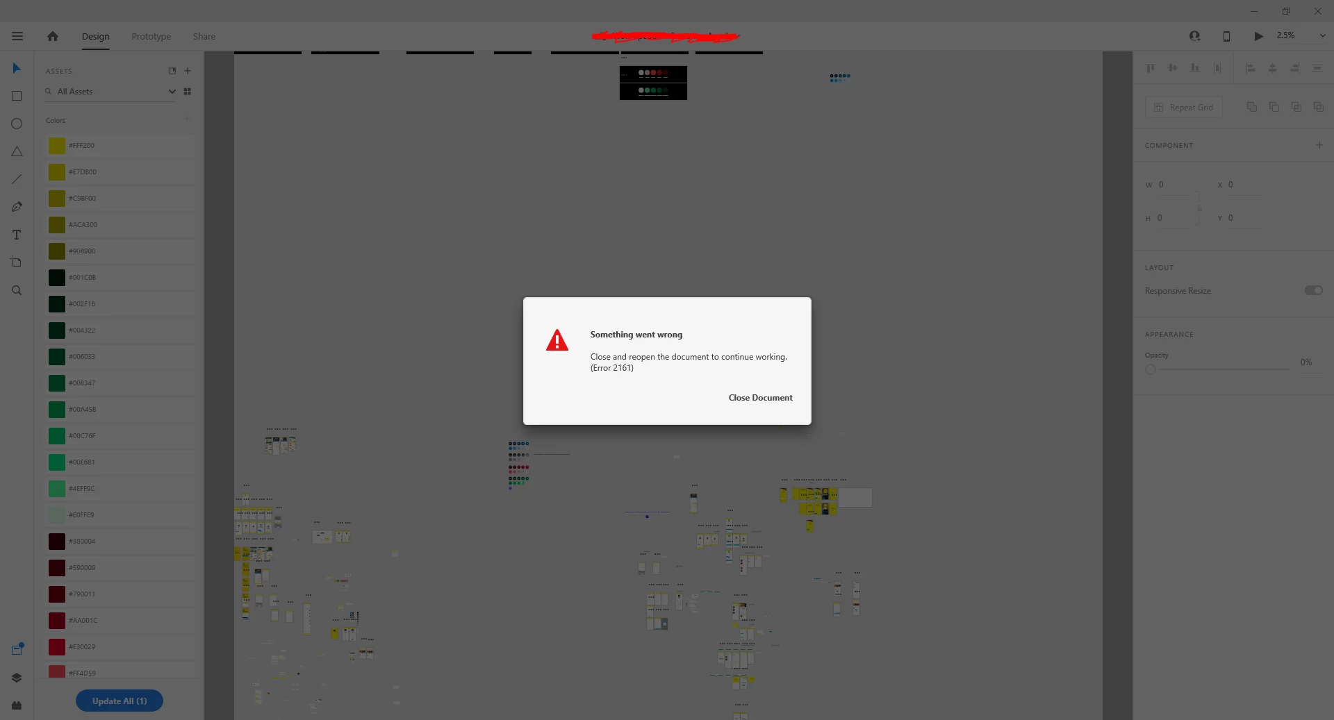 I can no longer open my document or continue working. This is the worst of the many crashes I've had with XD since starting my project in October. Now, after months of hard work I cannot do anything! Has anyone seen error 2161? When I search google nothing comes up, which is scary!