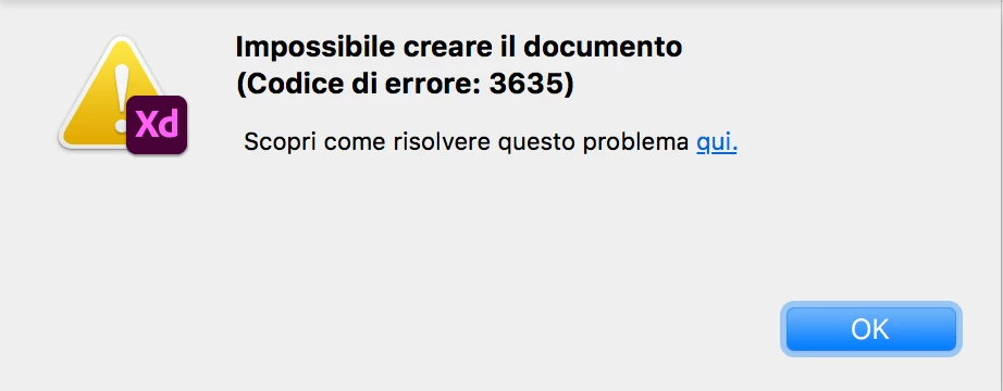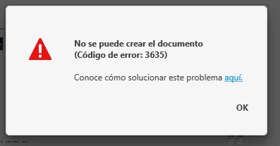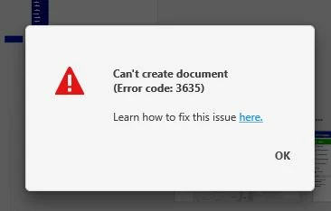 PS. Im Italian, in the image it says "Can't create a document, error code 3635"