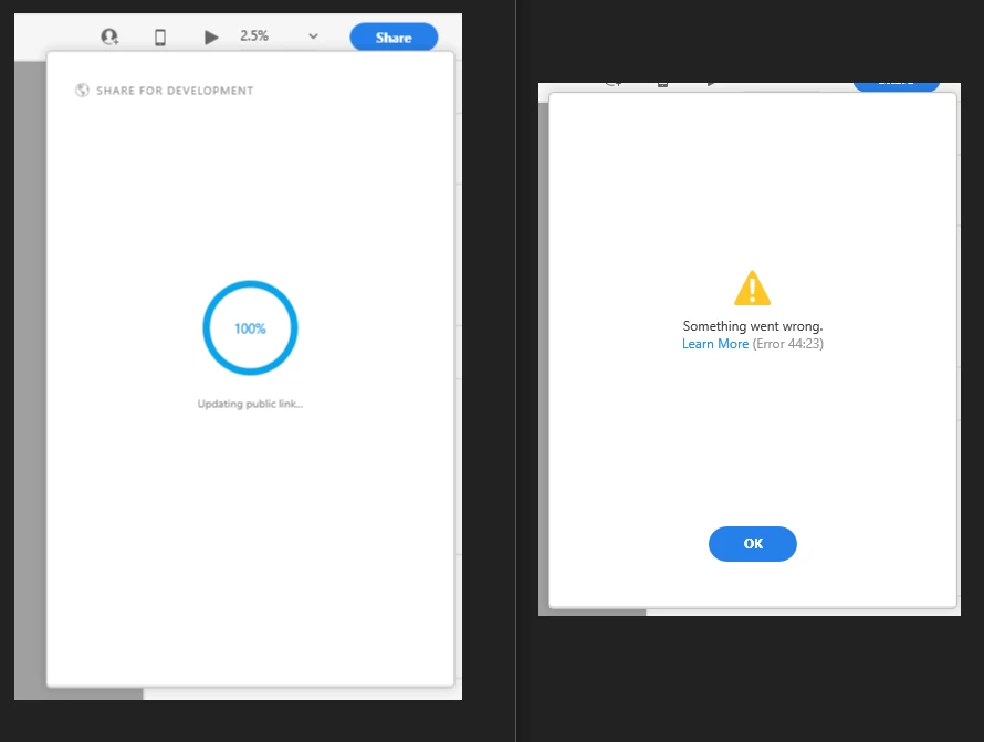 Error(44:23) in XD while share for development
