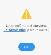Ddefaultl61hsnti5irnParticipantForum|Forum|4 years agoNovember 8, 2021QuestionError 44:76 sharing projectForum|Forum|4 years agoNovember 8, 20212 replies309 viewsHi there, everytime I try to share my project, an error 44:76 occurs. I reviewed all my image and convert it into PNG but it doesn't seem to work. I have the latest version of Adobe XD, running on a Macbook Pro Intel. Can someone help me with this ?