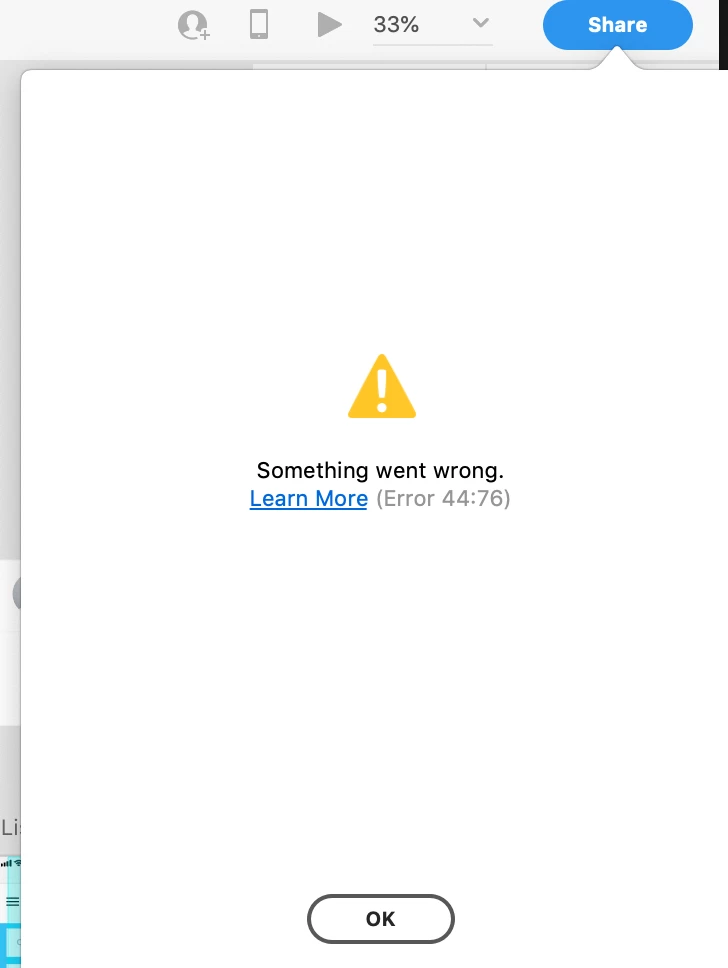 I’m facing an issue during sharing my project for development (Share for development feature). ‘Updating public link…’ is reaching 100%, but in the end a warning pop-up is appearing with information: "Something went wrong. (Error 44:76)