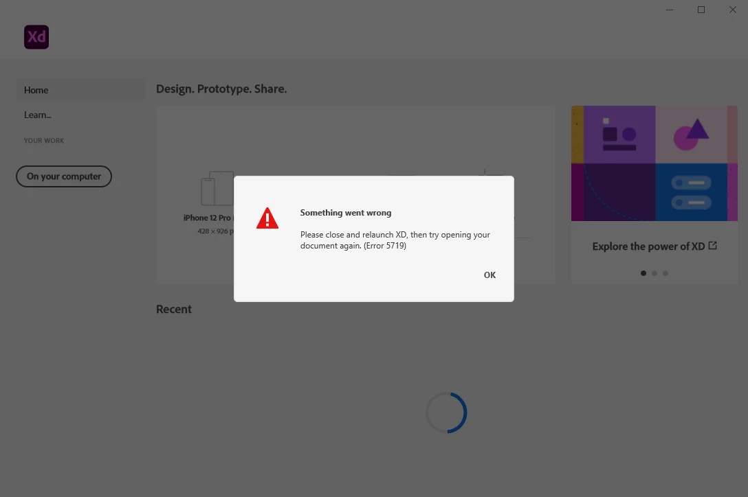 Two months ago approx. Ive started experiencing a lot of slowlness and errors in XD, added to the problems Ive sometimes experience regarding the update difference (the automatic updates do not always work) between my workmates sharing documents and me. Lately, this slowness has increased very much, the usual sympton is that I can not type in the app (I type in a word processor and then copy-paste it .... very frustrating). When this slowness got to a lot of delay in my work, I decided to unninstal the app and install it again. It seemed it work, but unluckily this was for only 10 days. Right now I am facing the 5719 Error when I try to open the app. What is curious about this error is that it pops up when I am opening the app (not a file), but in the file description it tells me to close the app and  try re opening the file again, which is something I was not trying to do (I did not clicked on an file lounching , I clicked the XD icon). Again, Ive tried unistalling and re-installing, but this error appears again after doing so. Any clue of what might be happening? Should I unnistal the Adobe Creative Cloud?Should I create a new Adobe account? I have no idea of what might be happening and I need to do stuff in XD asap. Thanks. Mercedes
