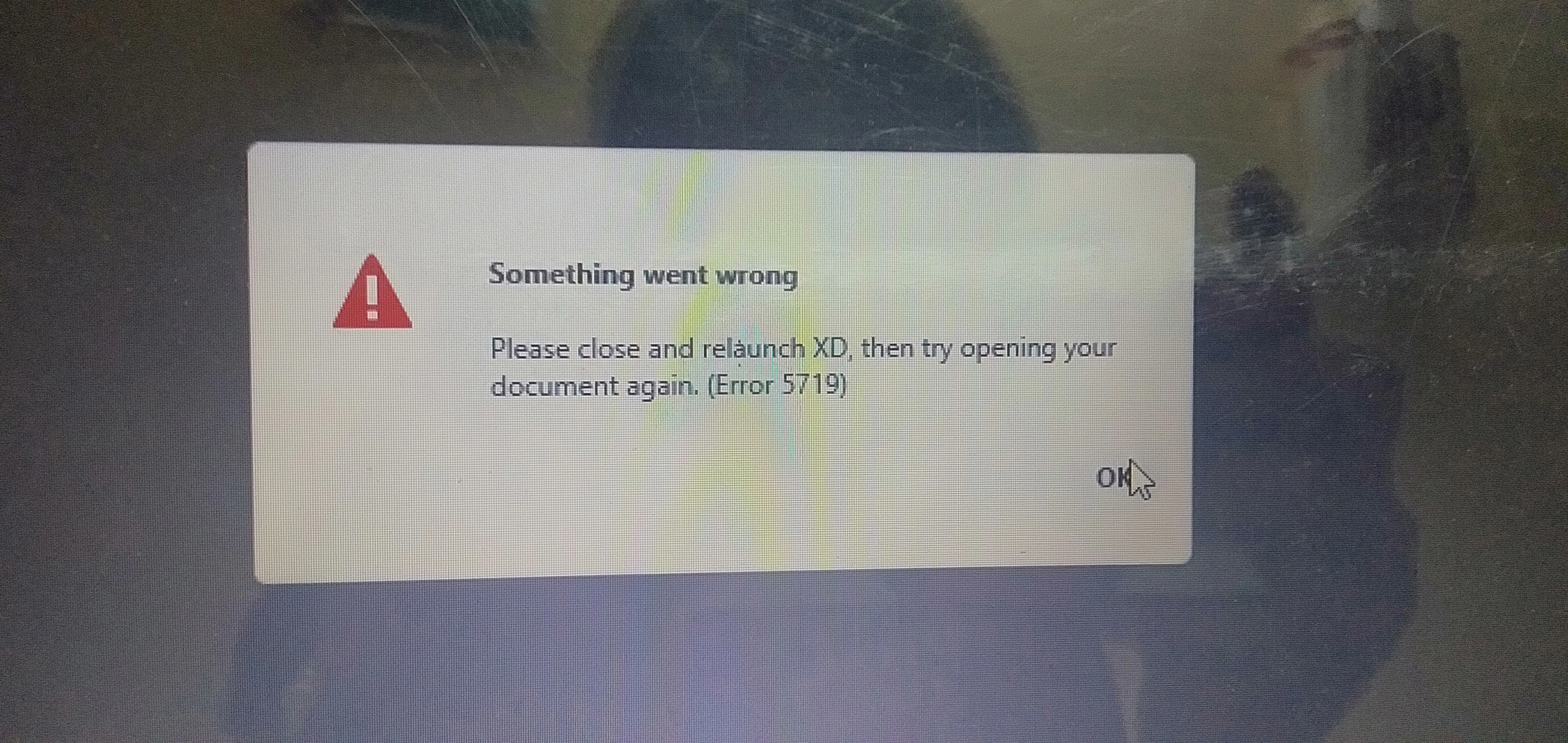 Please Close and Relaunch XD, then try opening your document again. (Error 5719)"