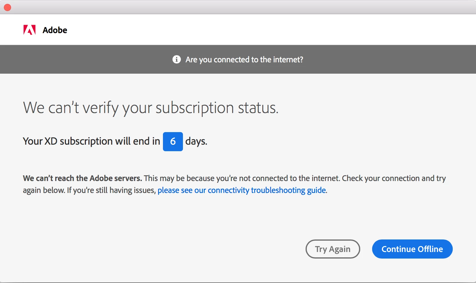 We can’t reach the Adobe servers. This may be because you’re not connected to the internet. Check your connection and try again below. If you’re still having issues, please see our connectivity troubleshooting guide.