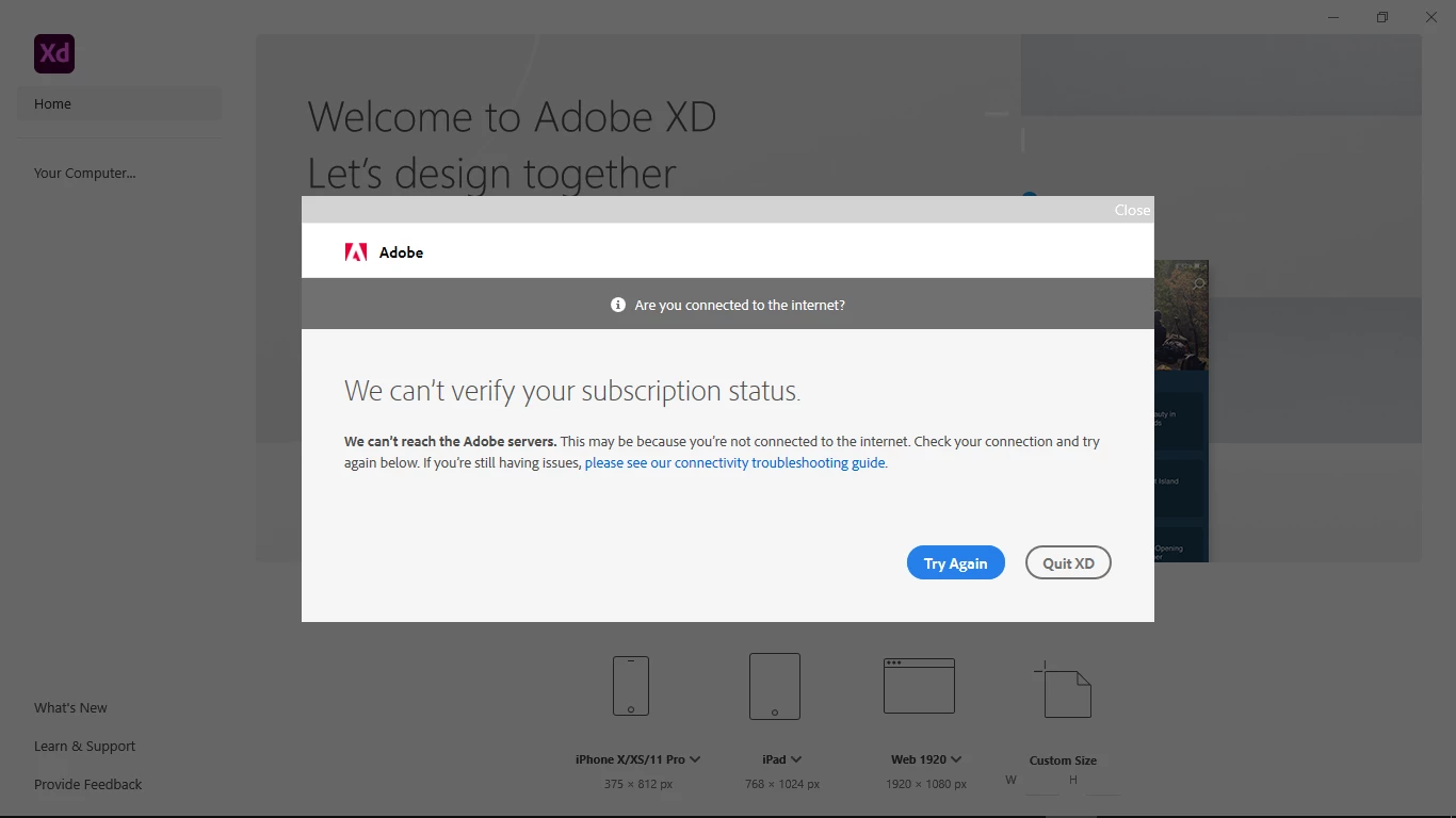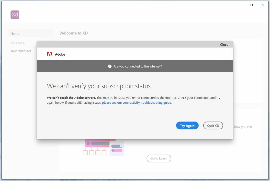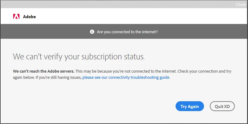 I have a problem with Adobe XD which is that when I open the application I see a message written in it We can’t verify your subscription status.