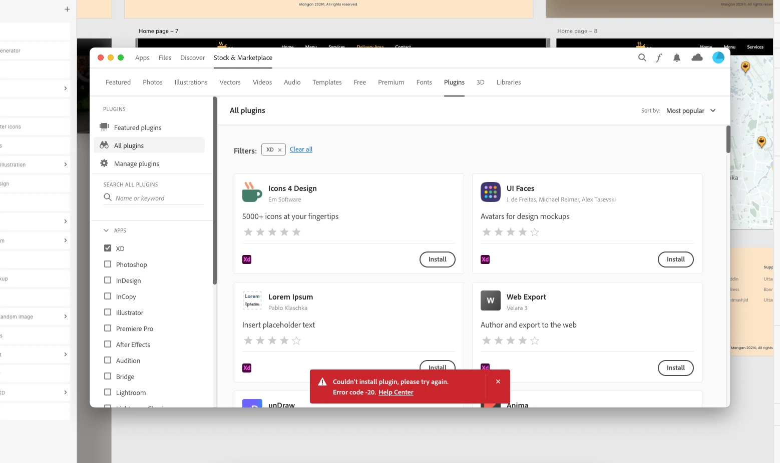 Error -20 while installing plugins in XD, how can I solve this?