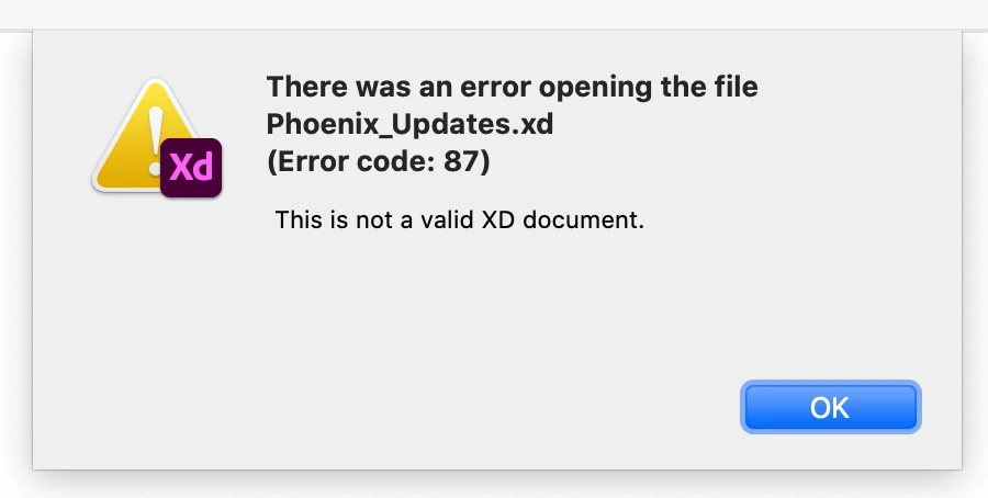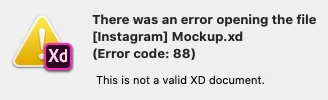The message reads: "There was an error opening the file (Error code: 88). This is not a valid XD document." I've tried updating XD and is now verson 24.0.22.19 and my file was saved in my computer. My computer is Windows 10. I appreciate your help, I've gotta get this done by this Friday 😞